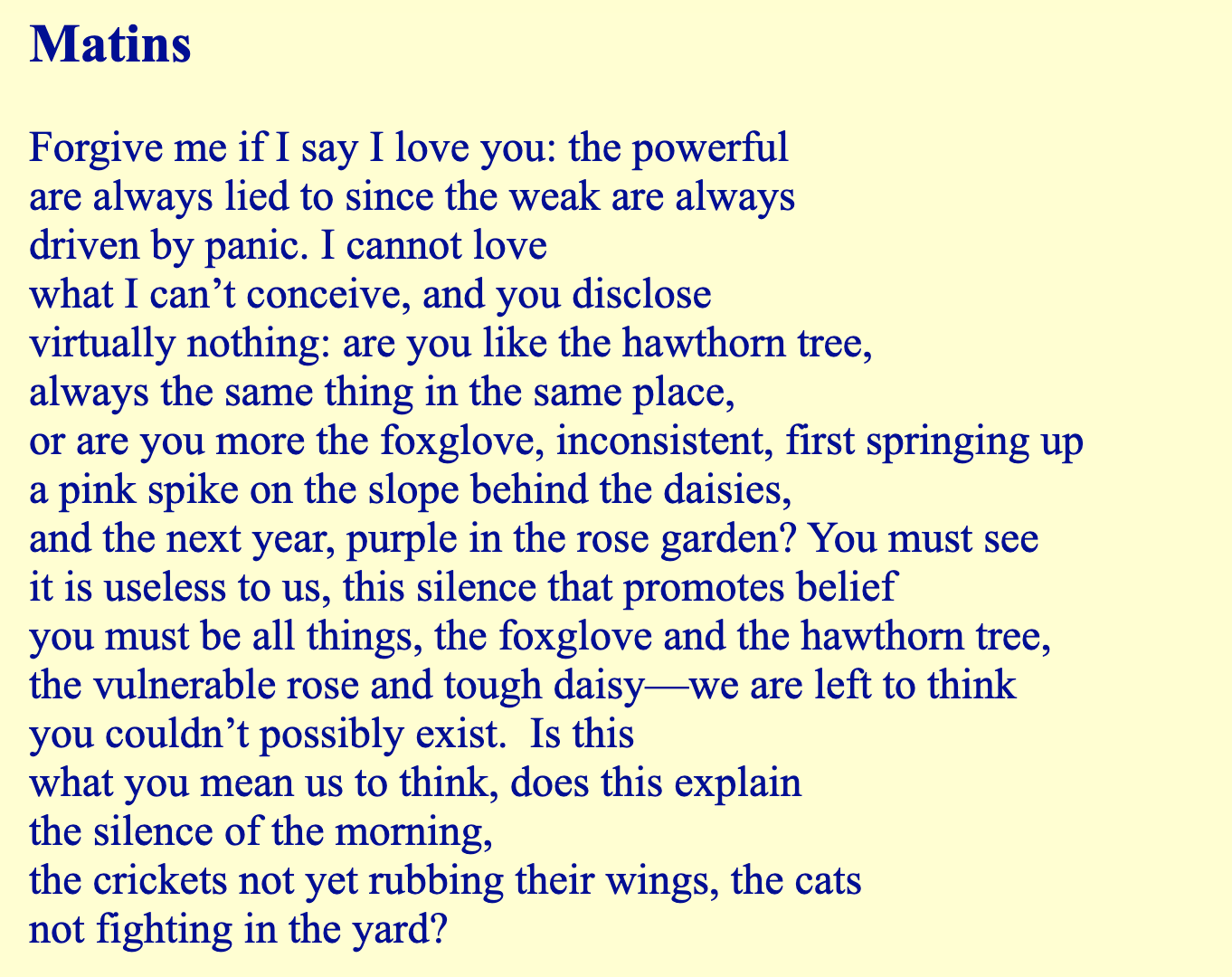 Apparently Gluck wrote another poem called Matins as well. Maybe she wrote many. Maybe these are prayers.